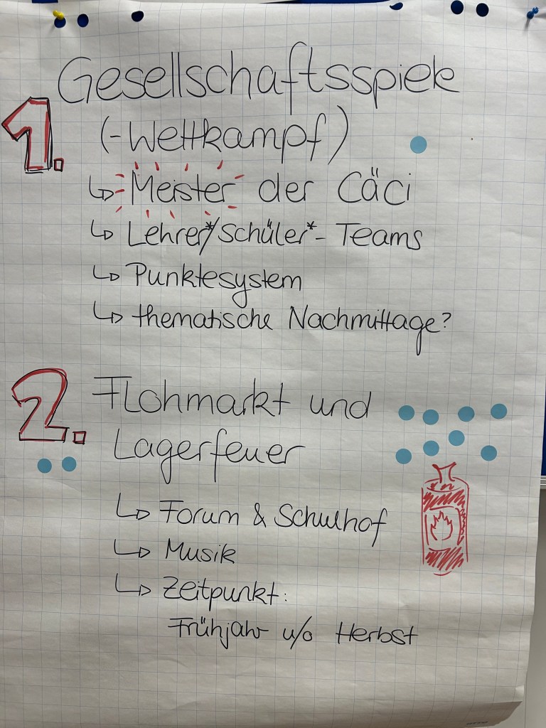 Auf dem ersten Blauen Forum haben fünf Gruppen ihre Ideen präsentiert, drei davon haben sehr ähnliche Ideen entwickelt. Die meisten Stimmen hat „Ein Forum als Ort der Begegnung“ bekommen. Dieser beinhaltet, das Forum als Raum für Schüler:innen zu öffnen (Was wir ja bereits getan haben).